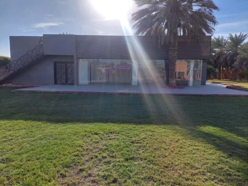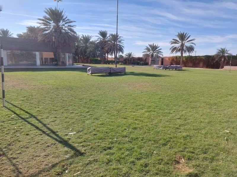ومسطحات خضراء ونخل وجلسات خارجية وغرف حراسة