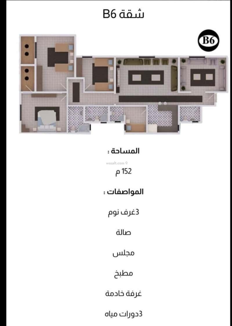 تتكون من مجلس ودوره مياه وصاله كبيره ومطبخ راكب وغرفه خادمه بدورة مياه و٣ غرف نوم وحده منها ماستر ودوره مياه ثالثه وبلكونتين
