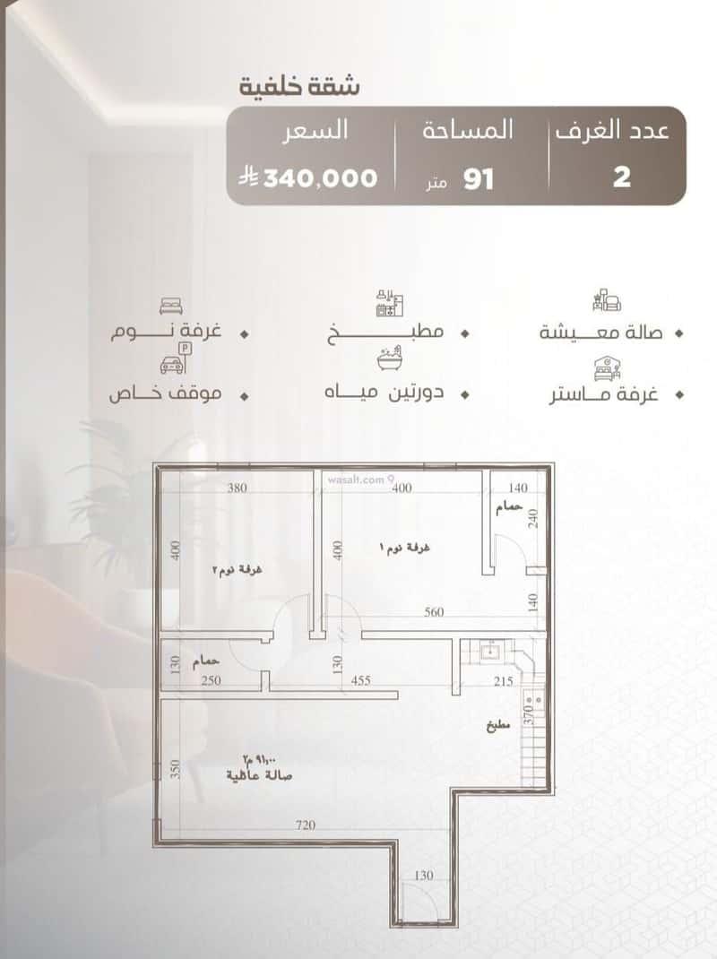 ▫️شقق 2 غرف صالة مطبخ خزان مستقل علوي وسفلي خاص وعداد كهرباء خاص موقف خاص بمساحة 91م خلفية: