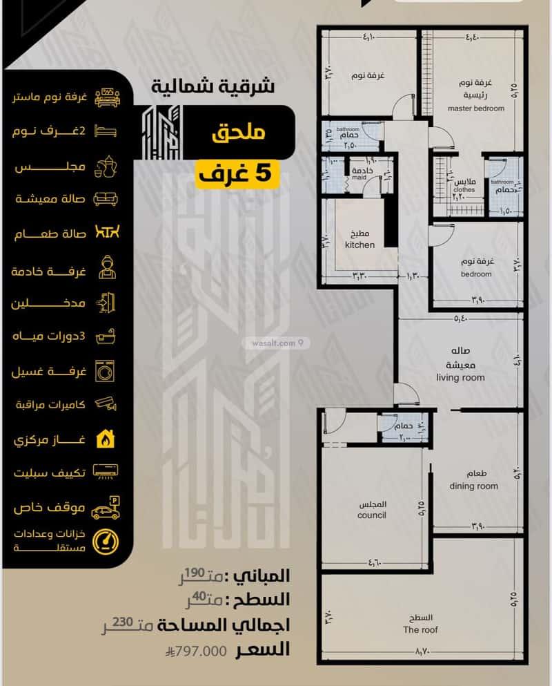 The property has 5 floors, 5 bedrooms, 4 bathrooms, 1 living room, 1 guest room
