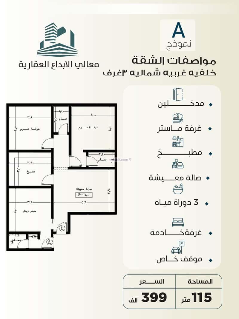 شقة 3 غرف خلفية مساحه 115م