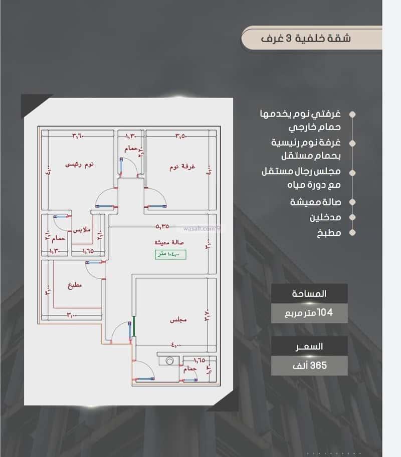 - *شقة 3 غرف ، 104م، السعر (365)الف.*