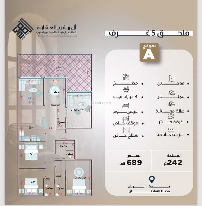 The property has 5 bedrooms, 3 bathrooms, 1 living room, 1 guest room