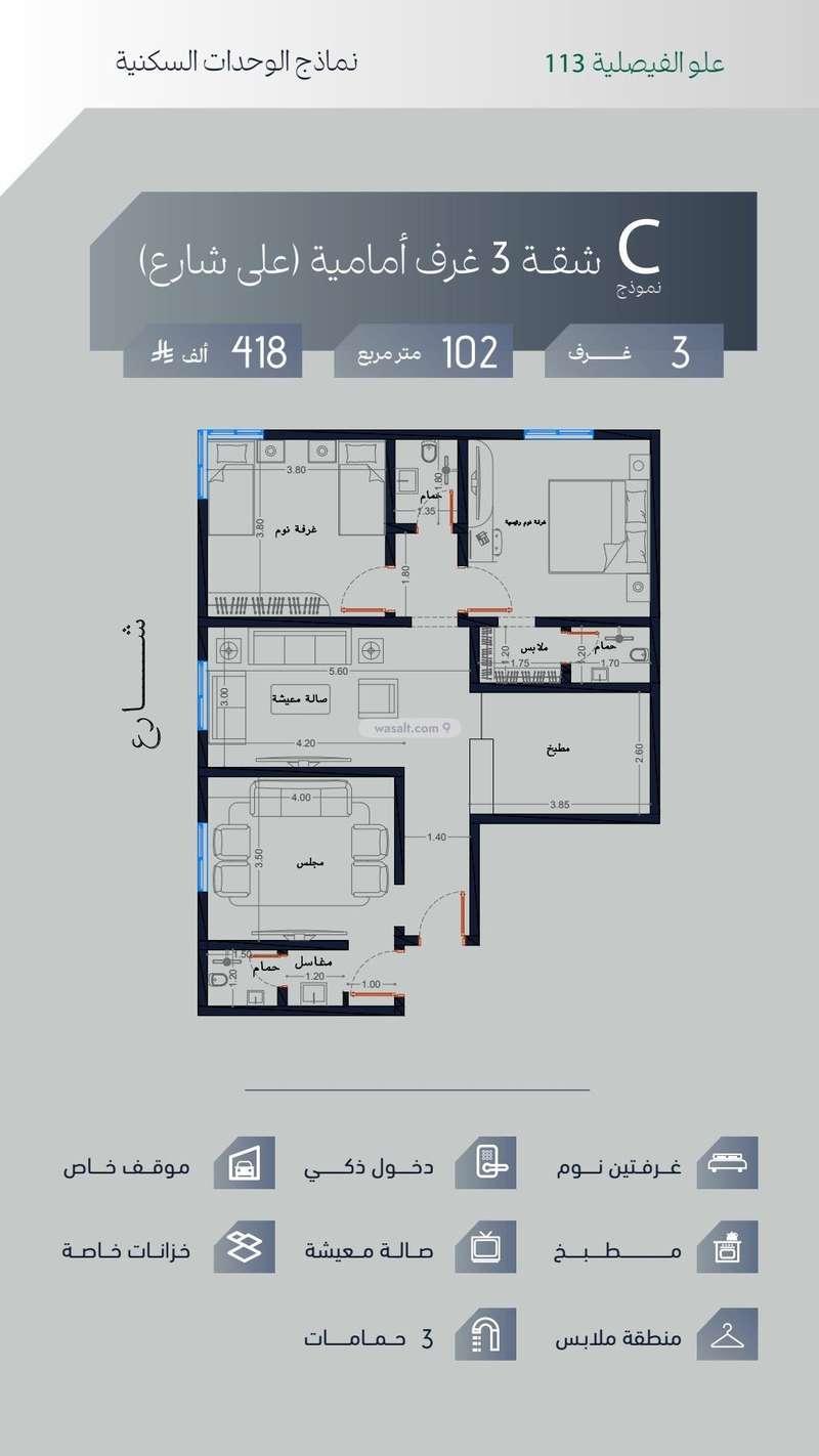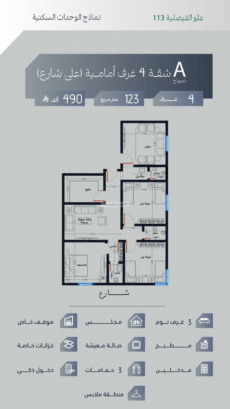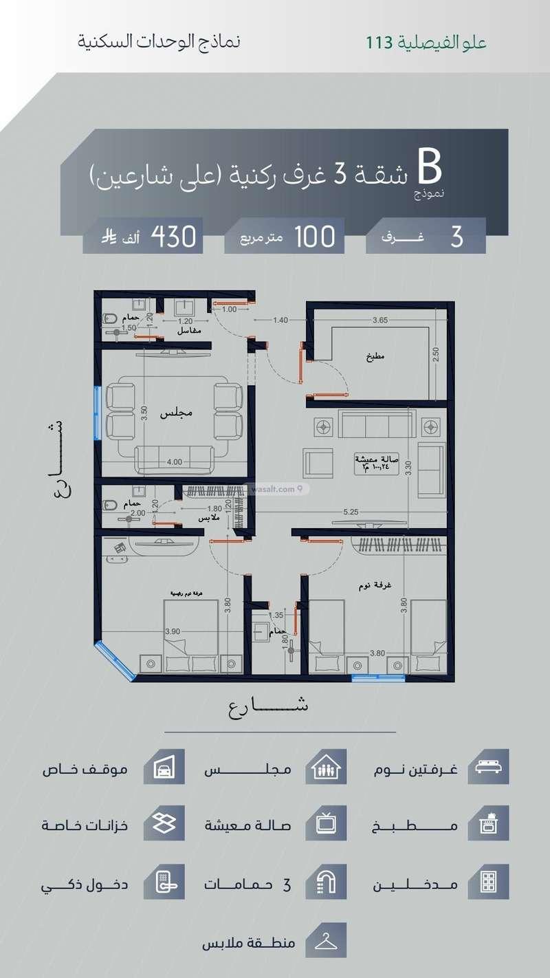 3 غرف ركنيه على شارعين مساحه 100م ب 430 الف
