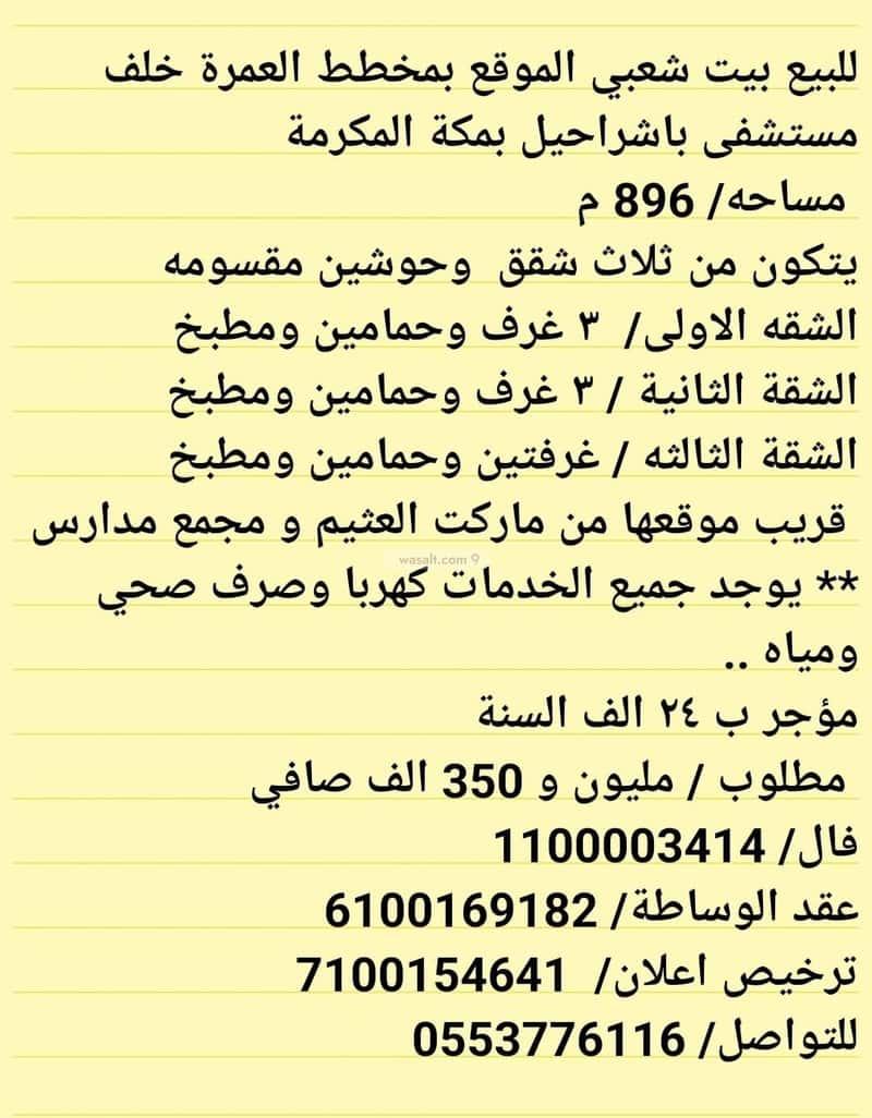 للبيع بيت شعبي الموقع بمخطط العمرة خلف مستشفى باشراحيل بمكة المكرمة