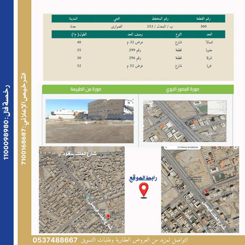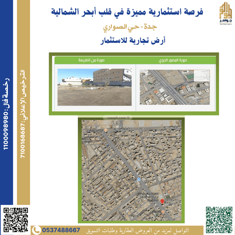 أرض تجارية للاستثمار تقع في حي الصواري، على شارع الملك فيصل (عابر القارات سابقًا)، أحد أهم الشوارع الحيوية في شمال جدة.