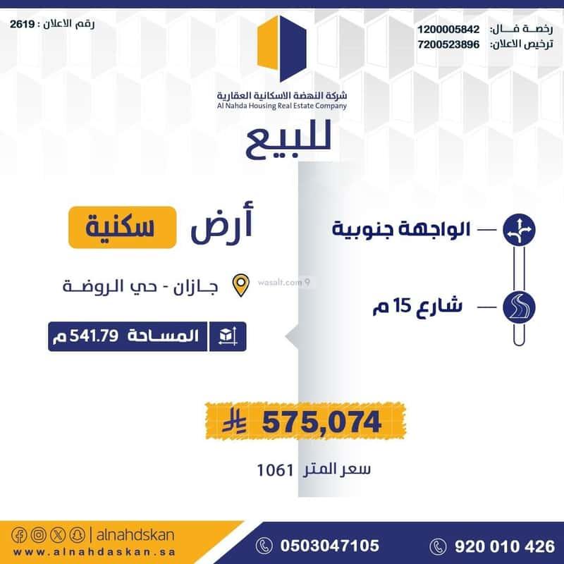 ارض للبيع جازان حي الروضة  الغرض من العرض : البيع  المساحة : 541.79م الواجهة : جنوبية  شارع : 15م السعر : 575,074.3 سعر المتر : 1,061.43  رقم الترخيص : 7200523896 رقم الاعلان : 2619 للتواصل والاستفسار : 0503047105 خدماتنا✨🔸تسويق عقاري احترافي🔸احتساب أعلى تمويل أفضل عروض البنوك🔸تعاملنا مع إدارات البيع المباشر يضمن لك أقل هامش ربح بالمملكة🔸 تأمين الدفعات المقدمة🔸سداد وتوحيد المديونيات🔸إمكانية التضامن لرفع قيمة التمويل🔸 إدارة أملاك🔸  النهضة الاسكانية العقارية اختيارك الأمثل لتملك عقارك وإنجاز أعمالك والتسويق وإدارة الأملاك