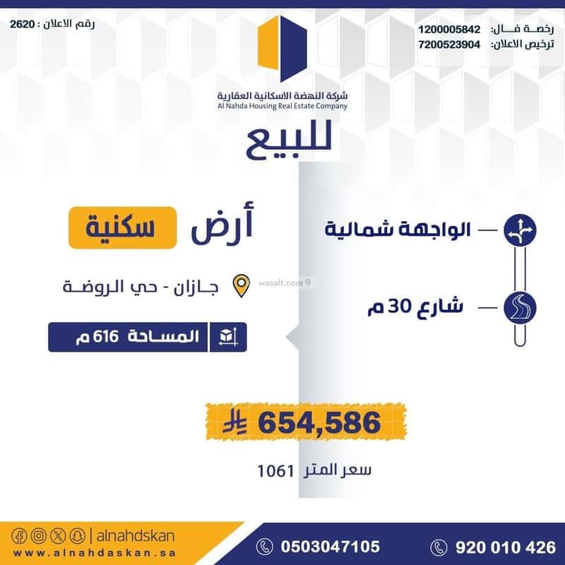 ارض للبيع جازان حي الروضة  الغرض من العرض : البيع  المساحة : 616.7م الواجهة : شمالية  شارع : 30م السعر : 654,586.32 سعر المتر : 1,061.43  رقم الترخيص : 7200523904 رقم الإعلان :2620 للتواصل والاستفسار : 0503047105 خدماتنا✨🔸تسويق عقاري احترافي🔸احتساب أعلى تمويل أفضل عروض البنوك🔸تعاملنا مع إدارات البيع المباشر يضمن لك أقل هامش ربح بالمملكة🔸 تأمين الدفعات المقدمة🔸سداد وتوحيد المديونيات🔸إمكانية التضامن لرفع قيمة التمويل🔸 إدارة أملاك🔸  النهضة الاسكانية العقارية اختيارك الأمثل لتملك عقارك وإنجاز أعمالك والتسويق وإدارة الأملاك