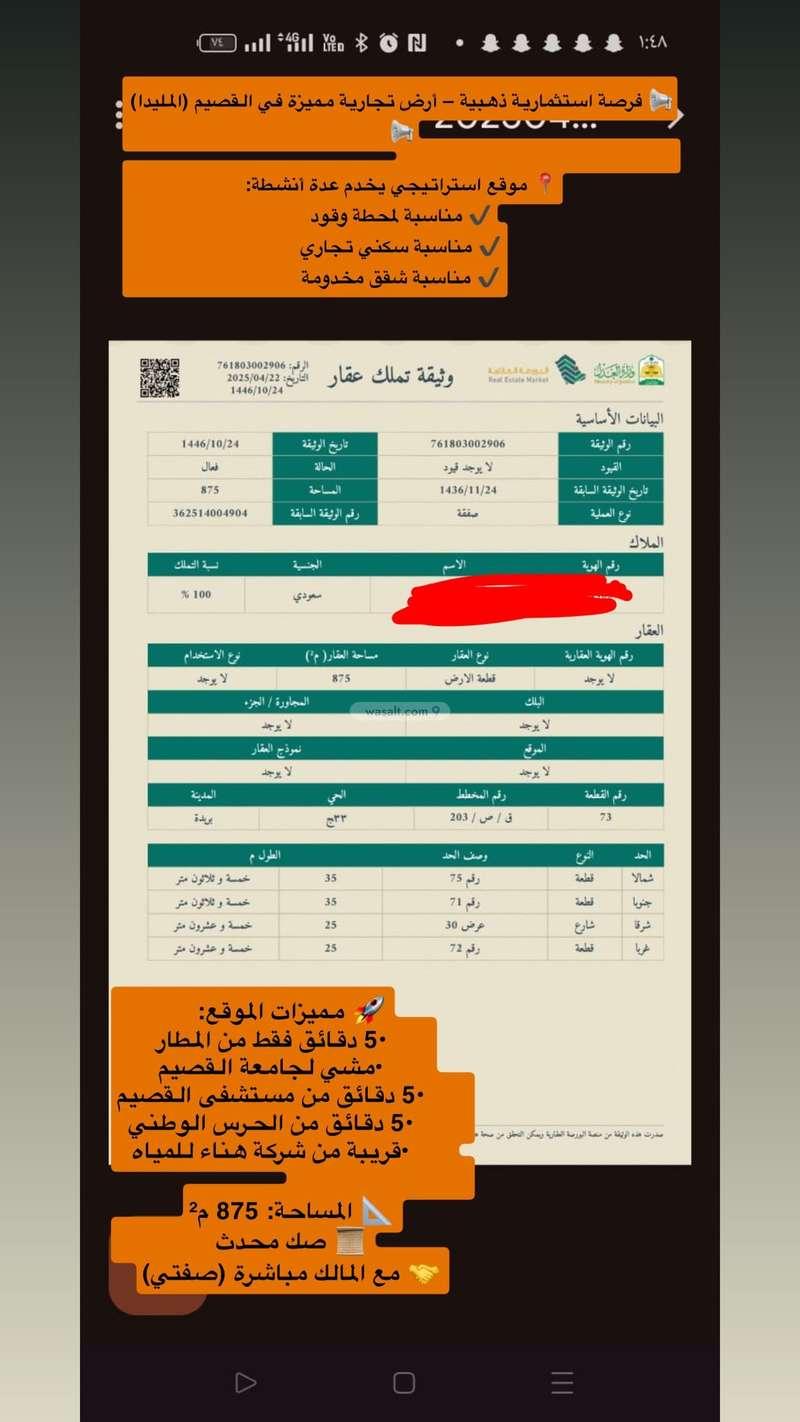 📢 فرصة استثمارية ذهبية – أرض تجارية مميزة في القصيم (المليدا) 📢