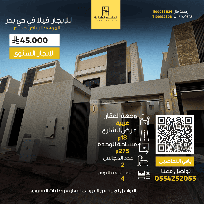 · الدور الأول (4 غرف نوم منهم 2 ماستر + صالة +حمام)