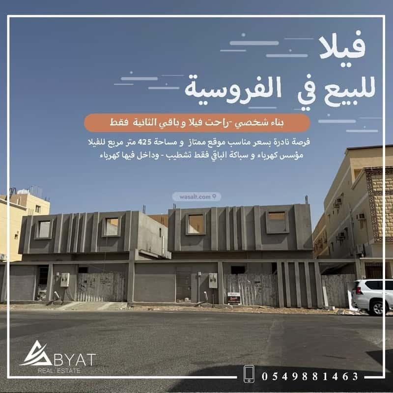 فيلا للبيع في الفروسية بجدة فيلا دور مساحة 425 متر مربع على حرف تي مكون من 6 غرف يوجد مخطط للفيلا للمعاينة تفضل بالتواصل معنا الفيلا دور ارضي و تصريح البناء دور وملحق و داخل كهرباء ومجهزة كهرباء و سباكة الباقي البويات و البلاط المطلوب مليون