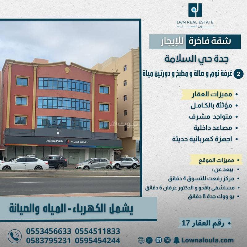 Furnished apartment for rent in Jeddah, Salamah neighborhood Two bedrooms, a living room, a kitchen, and a bathroom Two bedrooms, one of them is a master bedroom Living room Kitchen Two bathrooms Property features Including water and electricity Maintenance service throughout the contract period Newly furnished Electrical appliances available Surveillance cameras Building entrance Modern interior elevators Covered parking lot Security service Location features Direct access to Sari Road (6) minutes from Baqdo Hospital and Doctor Erfan (8) minutes from Yowook Mall Advertisement license 7200438787 License number: 1200000665 For more details, contact: (0583795231)