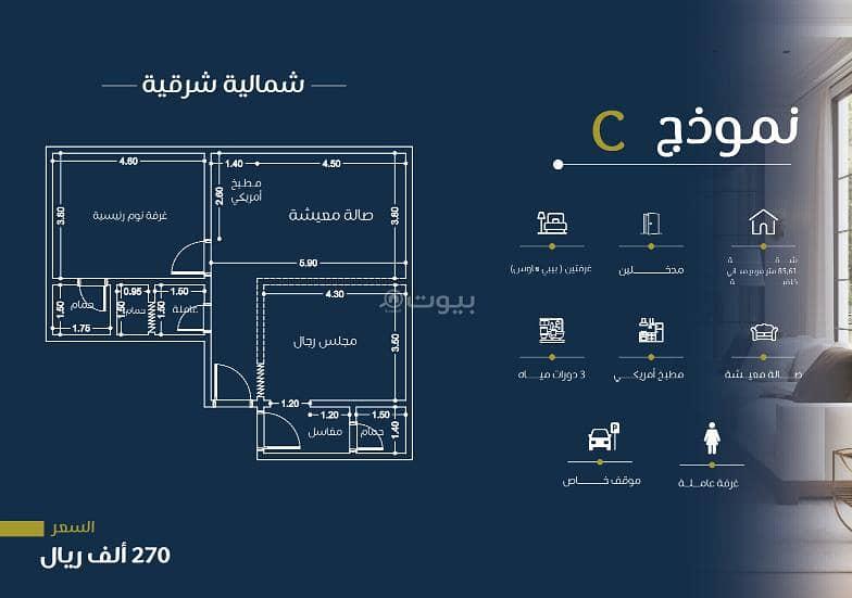 Apartment 2 for sale in Kayan Raudat Al-Faisal project 190 -- with a building area of 85 square meters Two entrances and consisting of: 2 bedrooms living room 3 bathrooms Maid's room Features: * Private parking * Near park and mosque * Separate upper and lower tanks * Two elevators * Smart home system (smart home) * Hidden defects warranty * Condominium for one year free of charge ------------------------------- Near Jeddah Park Near City Yard Near Corniche Al-Hamra Near King Abdul Aziz International Airport Asking for 270,000 * We also have other projects: Al-Nahda - Al-Zahra - Al-Rawda - Al-Salamah - Al-Faisaliyah - Obhur in distinguished locations - wide streets Commercial - administrative - residential Studio room Two rooms 3 - 4 - 5 rooms Commercial shops - Administrative offices