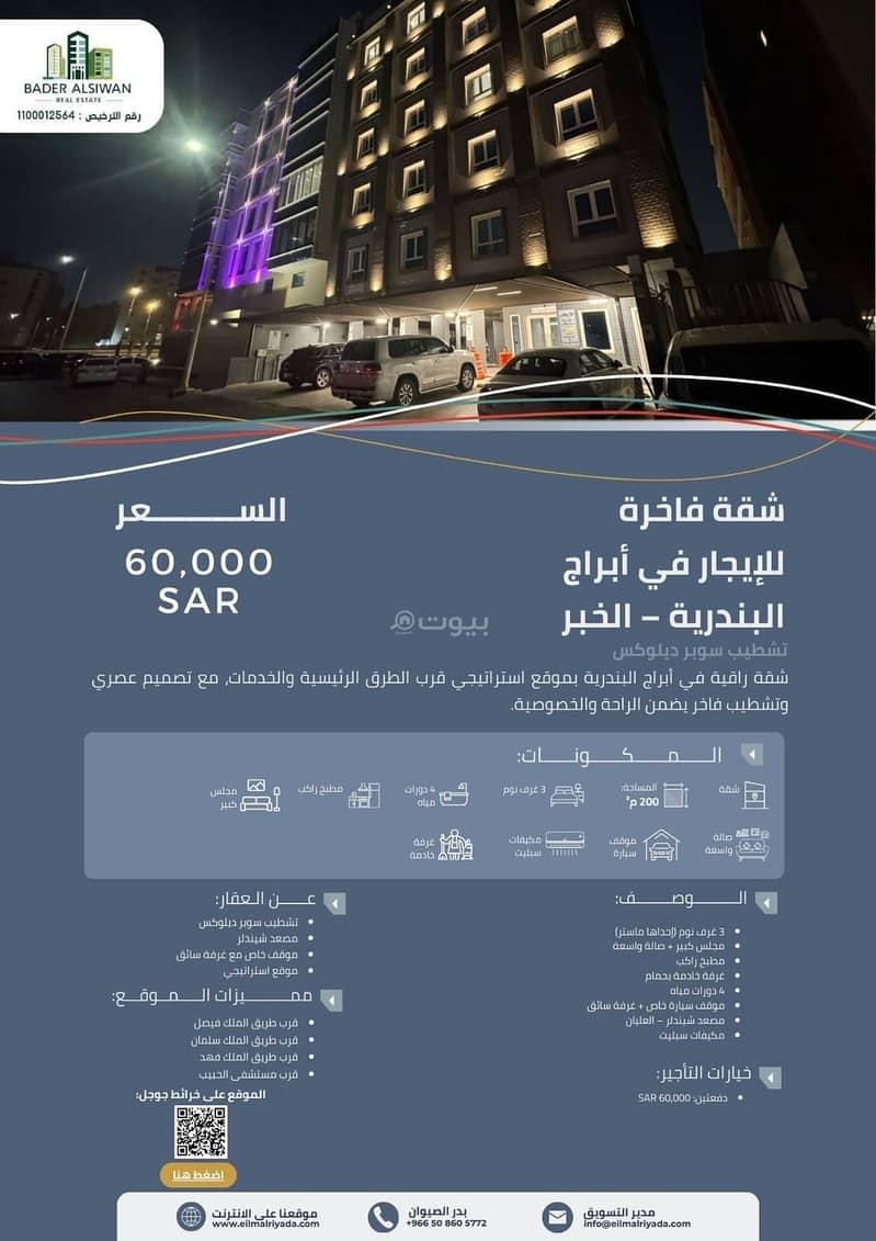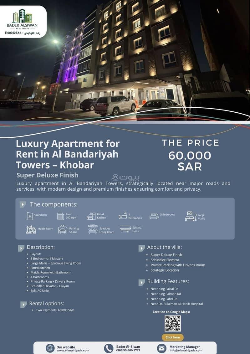 Area: 599.98 SQM Property Age: 3 Years Purpose: Residential Annual Rent: 60 thousand SAR Monthly Payment: Starting from 5 thousand and 350 SAR Apartment Details: – 3 Bedrooms (including a Master Bedroom) – Living Room and Spacious Hall – Installed Kitchen – Maid’s Room with Bathroom – 4 Bathrooms – Private Garage – Super Deluxe Finishing – Prime Location Near Major Roads and Services Key Feature: – Electricity Available