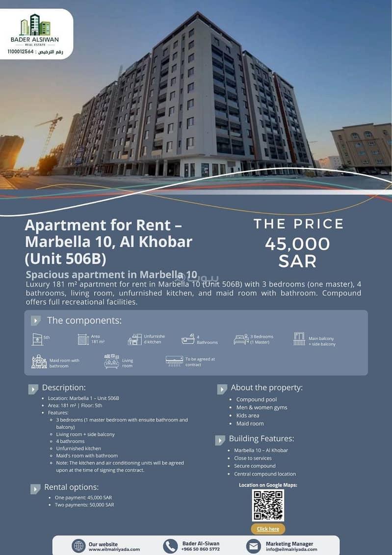 Luxury apartment for rent in Marbella 10 – Al Hamra, Al Khobar (Unit 506B).