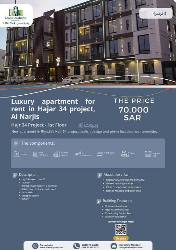 This three-bedroom apartment in Al-Narjis neighborhood, Riyadh offers ideal comfort and ample space for your family. The rental price is 70,000 Saudi Riyals per year, providing exceptional value in a prime location.