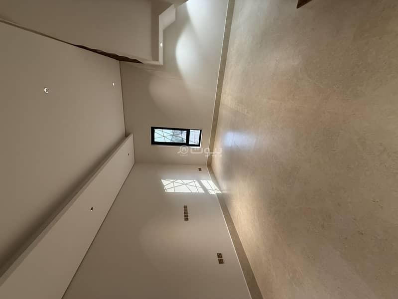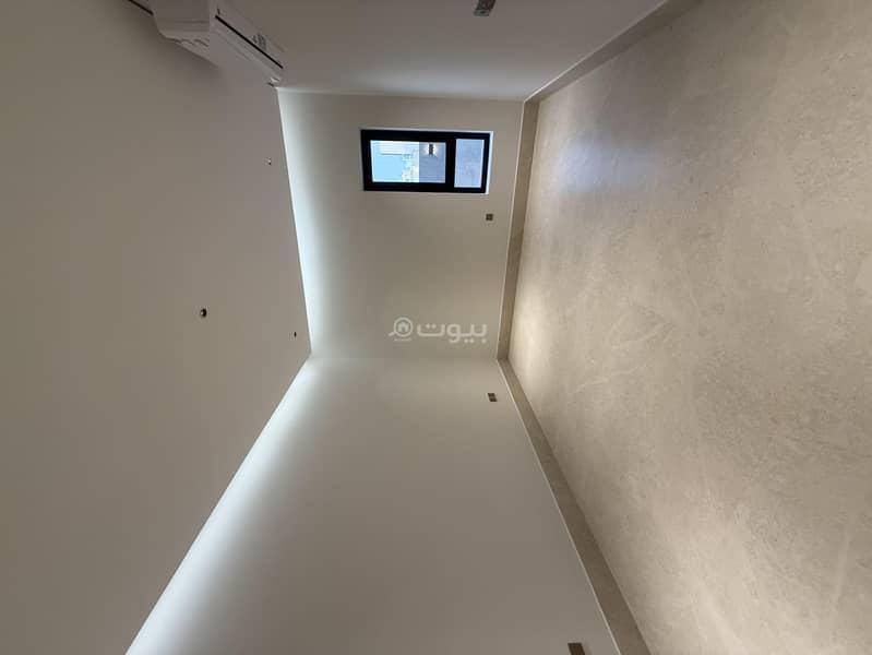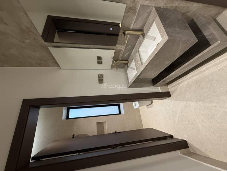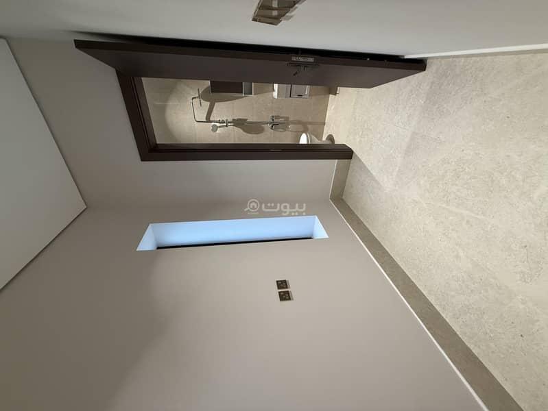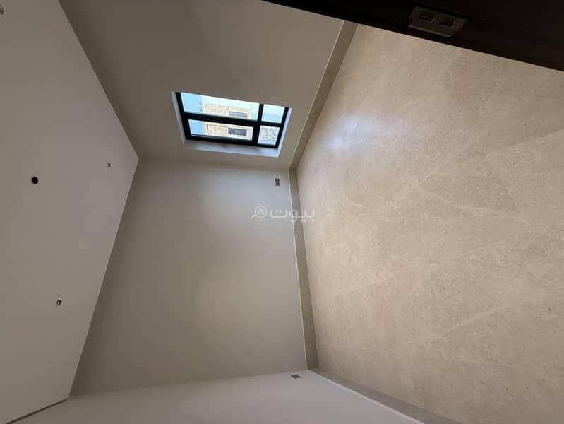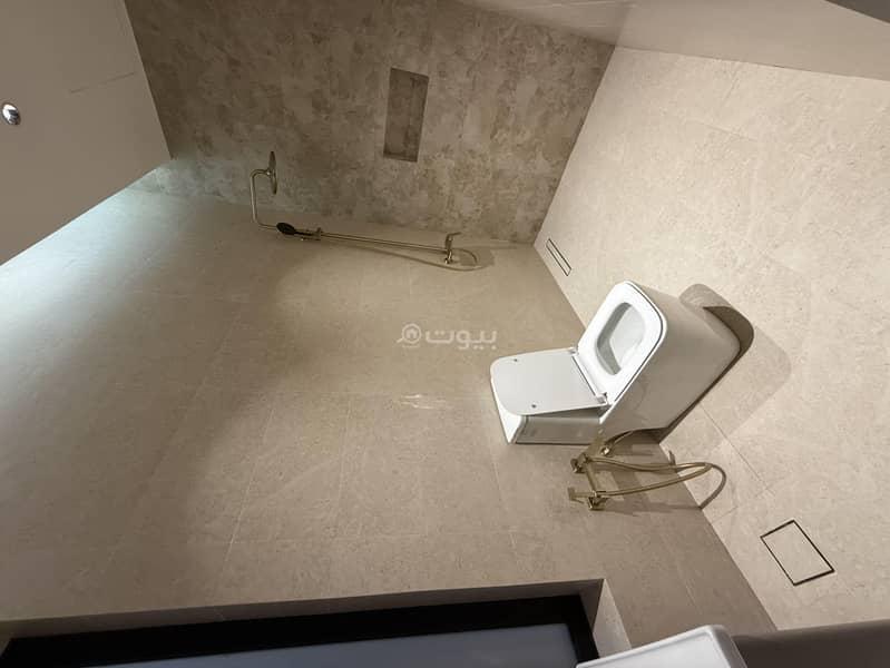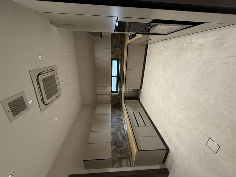 Two entrances: one for the living room with a bathroom serving it, and the other leading to the hall with a bathroom, maid’s room, and fitted kitchen.