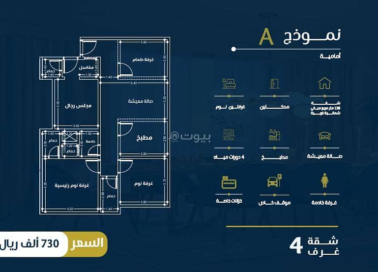 Apartment 4 for sale in Kyan Al-Nahda Project 175 --on a facade with a building area 141 square meters, two entrances and consisting of: 4 bedrooms living room 4 bathrooms Features: *maid's room *private parking *Near a garden and a mosque *Independent upper and lower tanks *two elevators *Smart Home system *Defects warranty *Condominium for one year for free ------------------------------------------ Near Red Sea Mall Near Jeddah waterfront Near King Abdulaziz International Airport Price: 730 thousand *We also have other projects in Nahda - Zahraa - Rawdah - Salamah - Faisalia - Obhur In prime locations - wide streets Commercial - Administrative - Residential Studio room Two rooms 3 - 4 - 5 rooms Commercial shops - Administrative offices