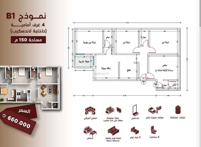 🏠 شقة 4 غرف أمامية (مع حديقة خاصة)، مساحة 150م، بسعر 660 ألف.