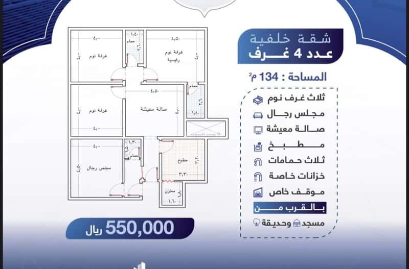 مكونة من: 4 ادوار و 5 غرف و 3 دورات مياه و 1 صالة و 1 مجلس