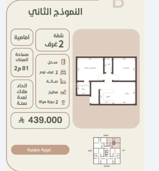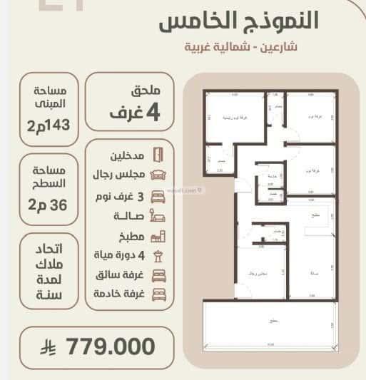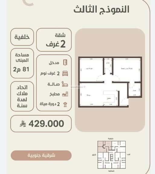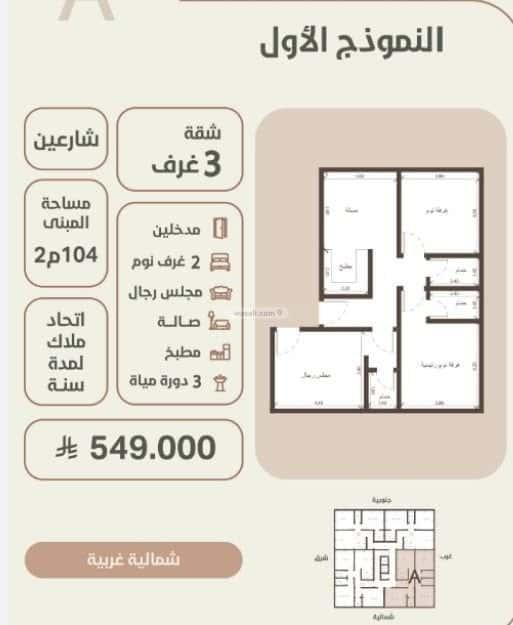 وحدة سكنية 3 غرف على شارعين المساحة 104م