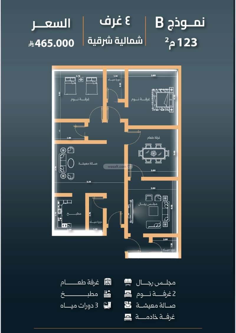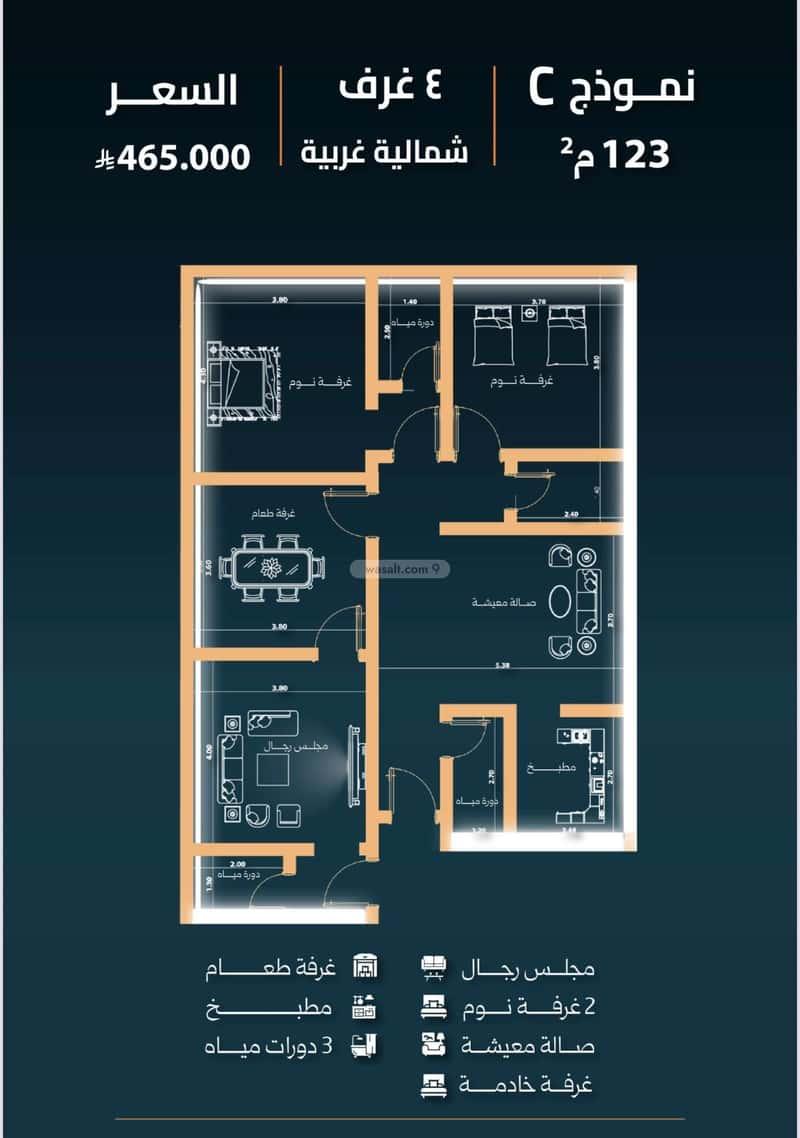 4 غرف شماليه شرقية مدخلين 3دورت مياه صاله معيشه مطبخ موقف خاص خزانات خاصه غرفه خادمه المساحه 123 م السعر 465 الف