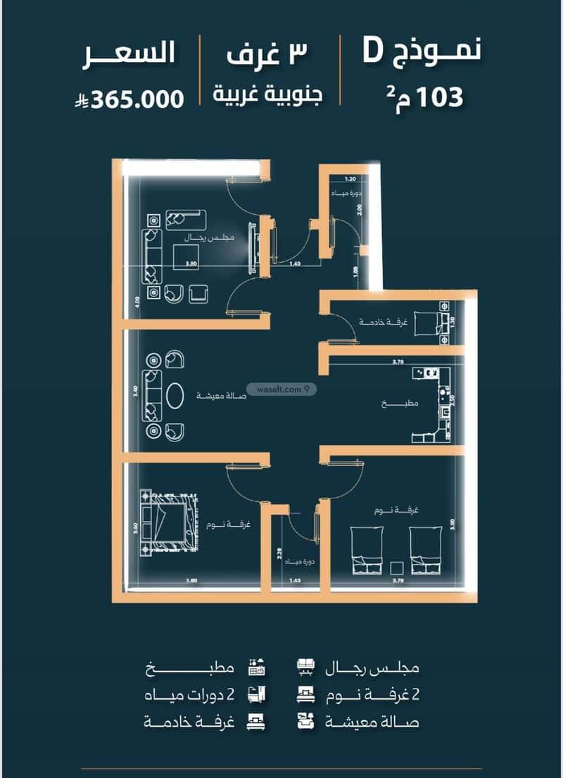 3 غرف جنوبية شرقية مدخلين دوتين مياة صالة معيشة مطبخ موقف خاص خزانات مستقلة غرفه خادمه المساحه 103 م السعر 365 الف