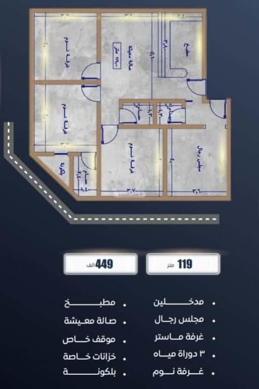* المساحة: 120 م² (مع بلكونة أمامية) السعر: 449,000 ريال