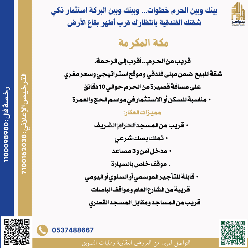 • مناسبة للسكن أو الاستثمار في مواسم الحج والعمرة