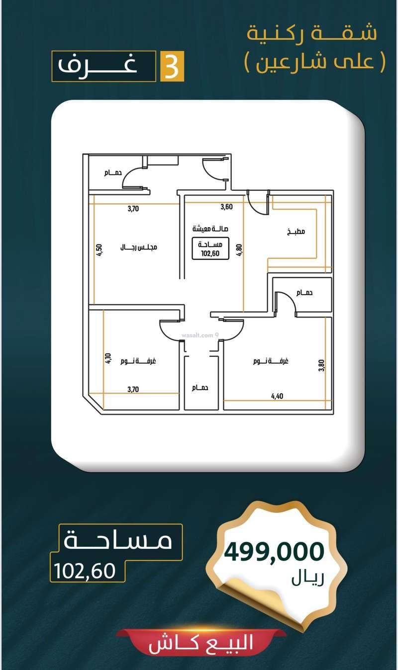 *🏠 شقة أمامية ركنية على شارعين (3 غرف): المساحة: 103م*