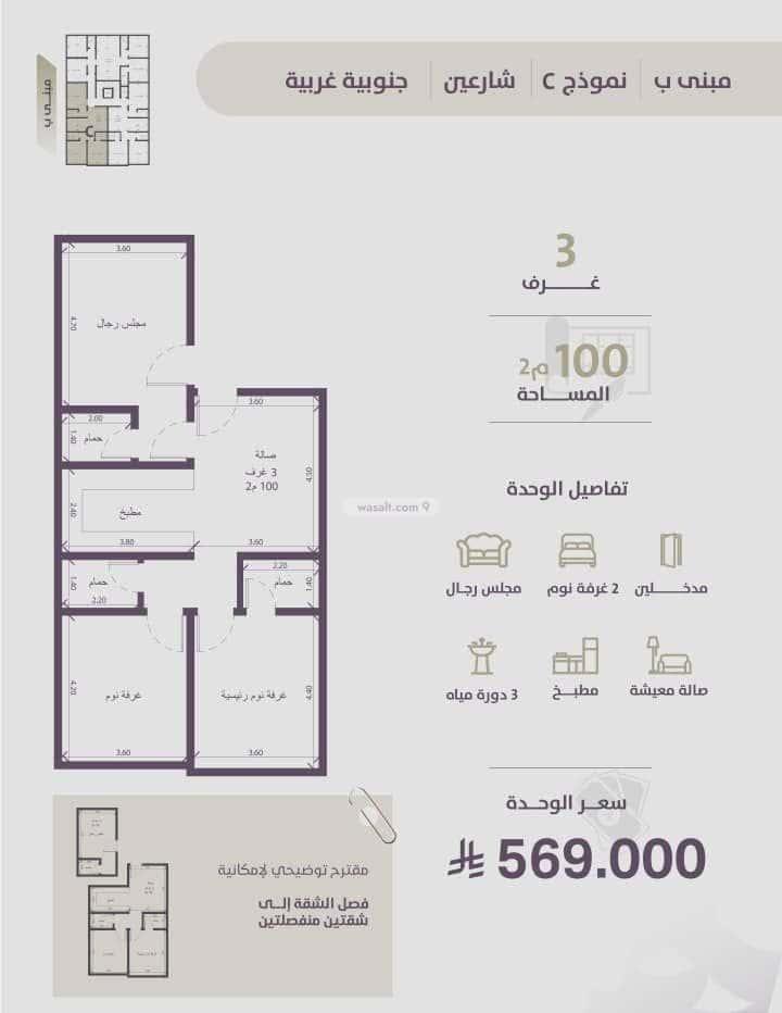 🏠 شقة 3 غرف ( شارعين)، مساحة 100م، بسعر 569,000.