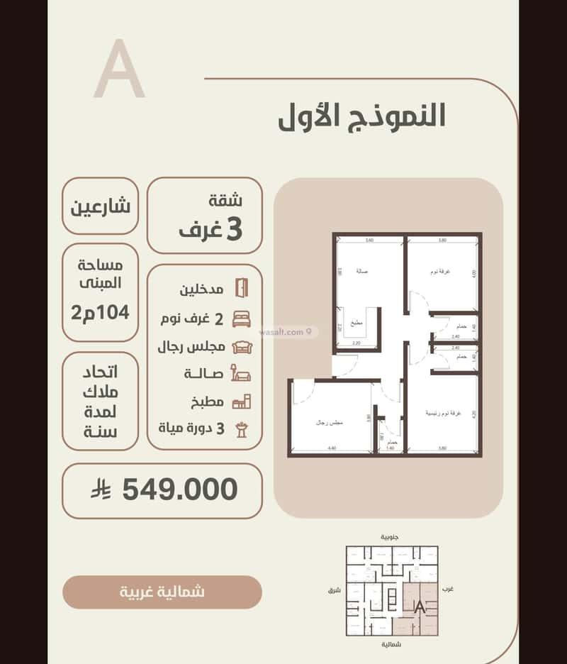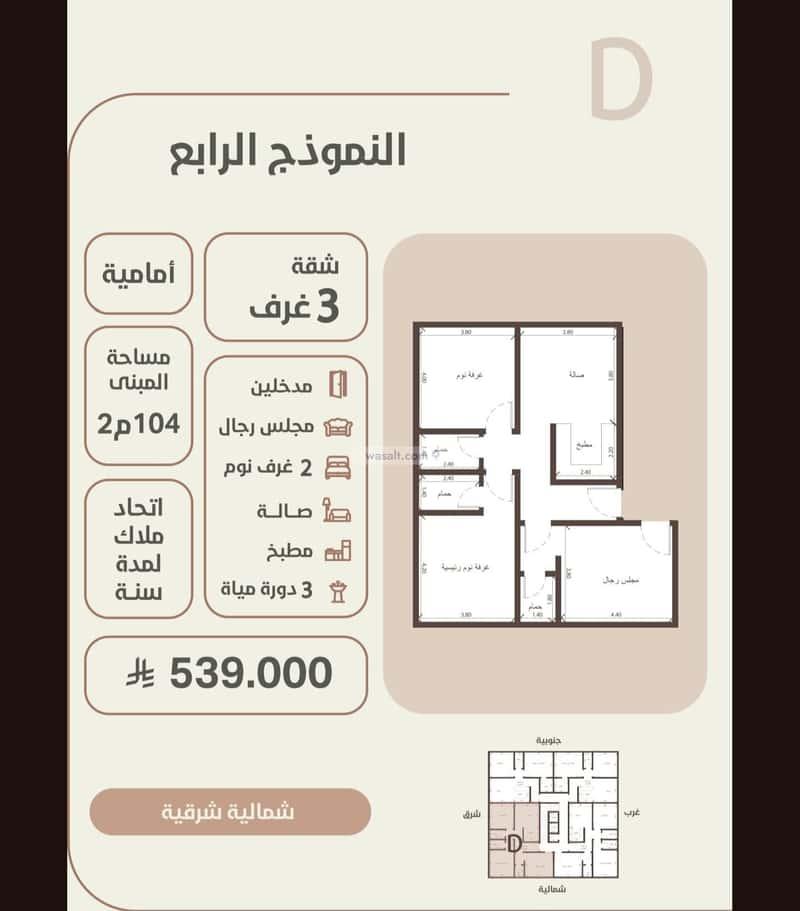 وحدة سكنية 3 غرف على شارعين المساحة 104م