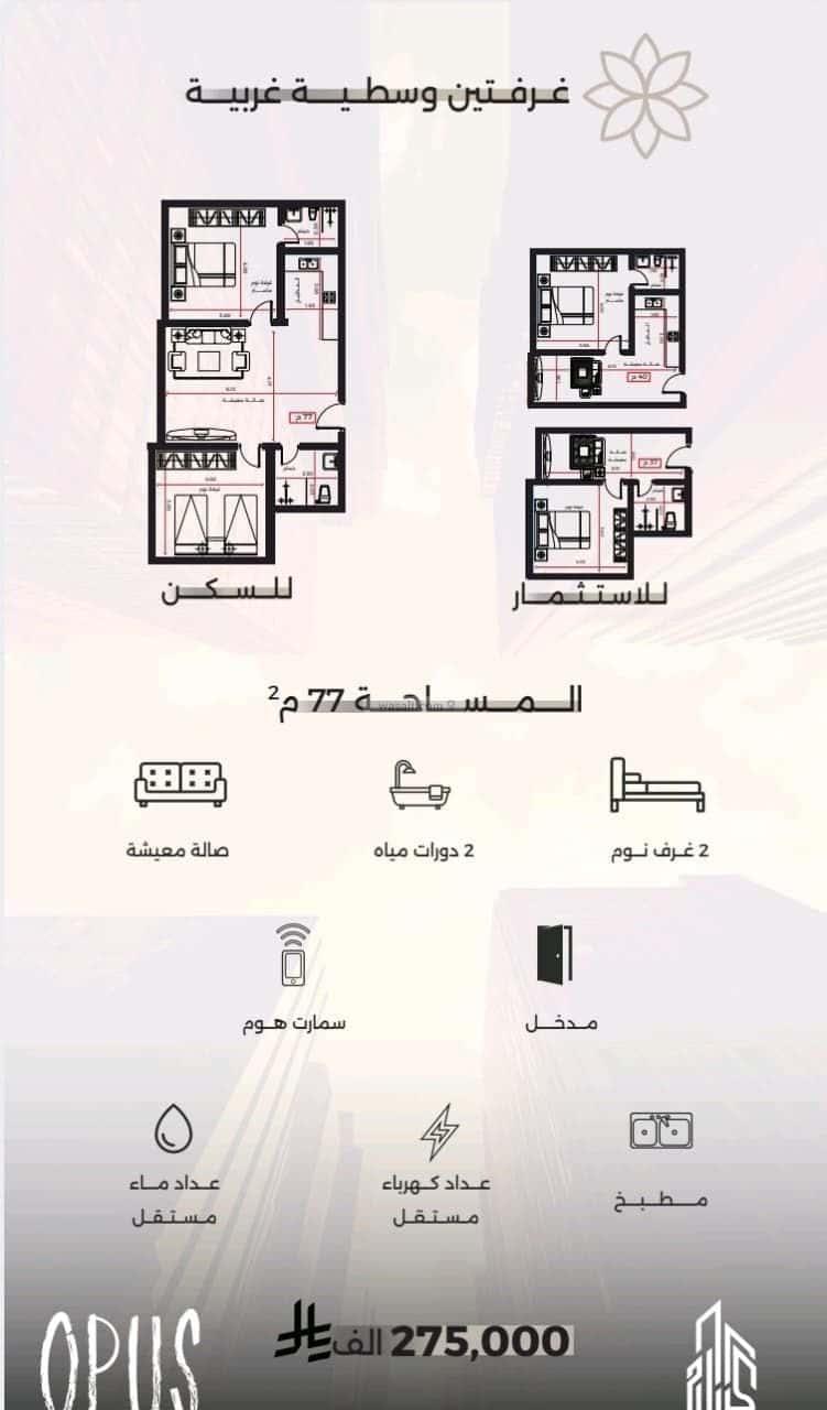 ▪️ شقة 2 غرف (وسطية) – 77م²