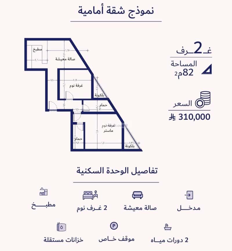 ( غرفتين  ببلكونات   - دورتين مياه  - صالة معيشه  - مطبخ  - خزانات مستقله علوي وسفلي  - عداد كهرباء مستقل  - موقف خاص  مساحتها 83 م2 )