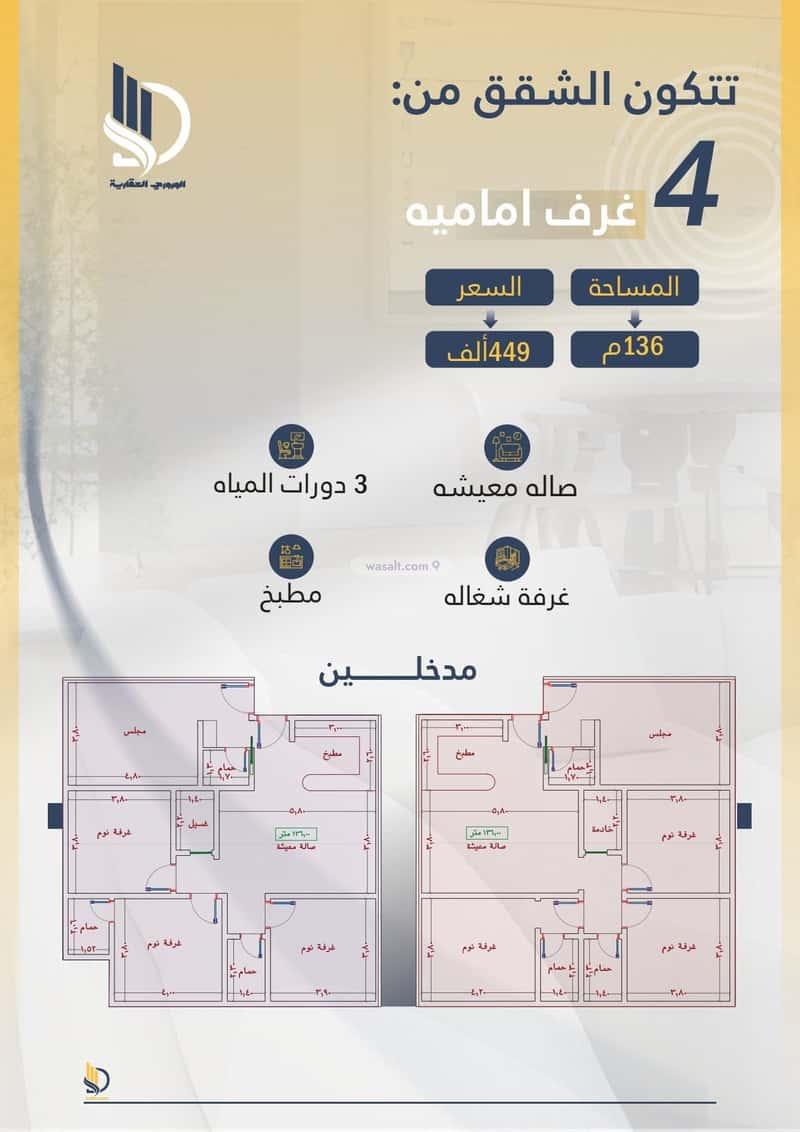 4 غرف ب ٤٣٩ الف على شارع سكني مساحه ١٣٦ اماميه