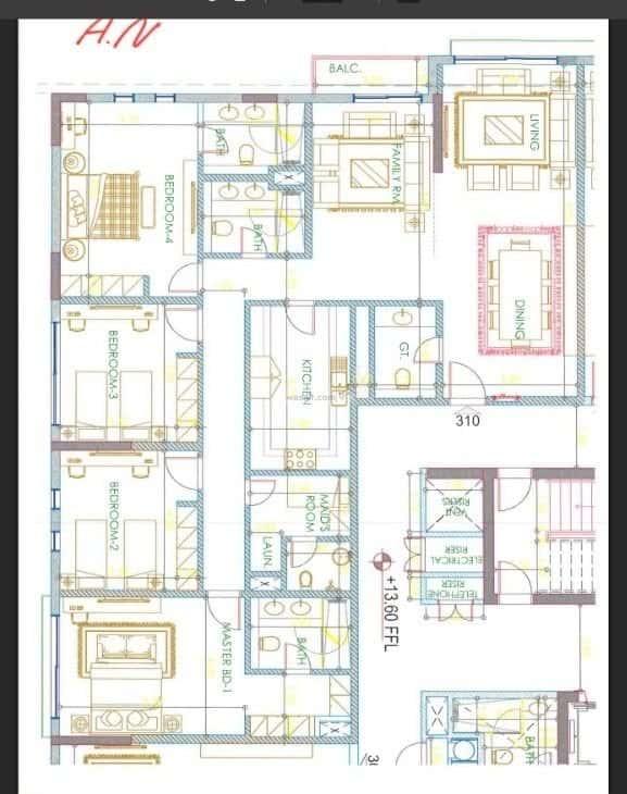 4 غرف نوم مجهّزة بدواليب مدمجة (2 ماستر)+ غرفة خادمة