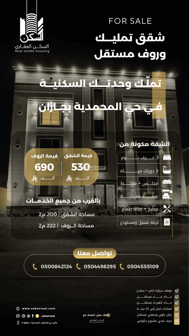 • 3 غرف نوم منها غرفة رئيسية (ماستر)