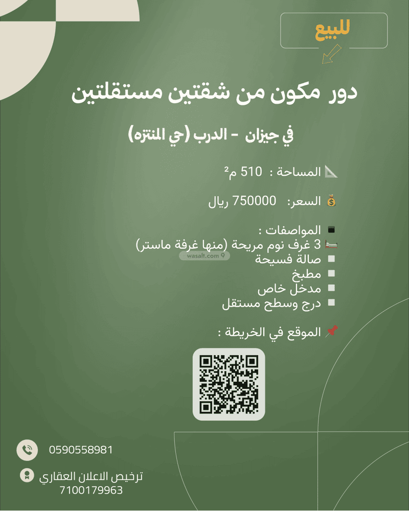 دور للبيع مكون من شقتين مستقلتين – في جيزان - الدرب (حي المنتزه)