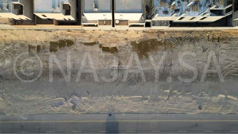 تتميز الأرض بواجهة غربية مطلة على شارع بعرض 20 مترًا، مما يوفر سهولة في الدخول والخروج وإمكانية تصميم واجهة معمارية جذابة.