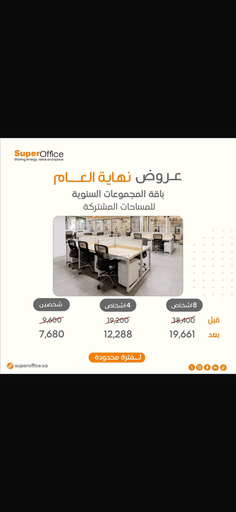مكاتب مؤثثة ومجهزة بالكامل مع قاعات اجتماعات ويوجد أيضا (مستودعات، ومواقف سيارات برسوم وشقة مكتبية ) ، وخدمات مجانية شاملة داخل مكتبك!