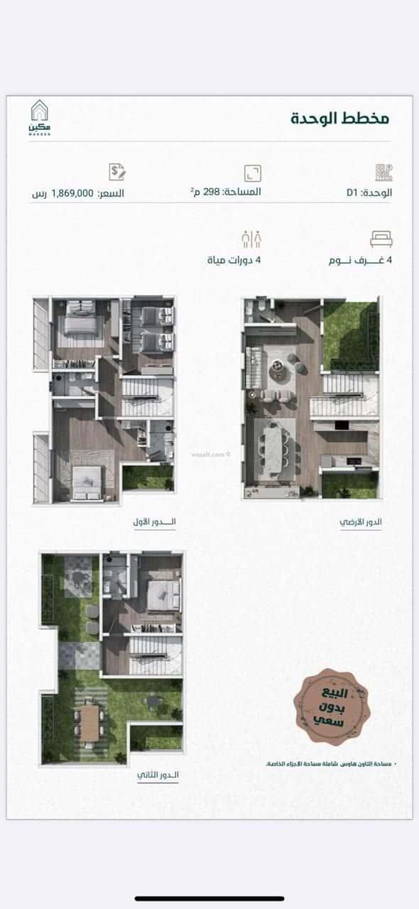 المساحه الكلية ٢٩٨ متر مربع