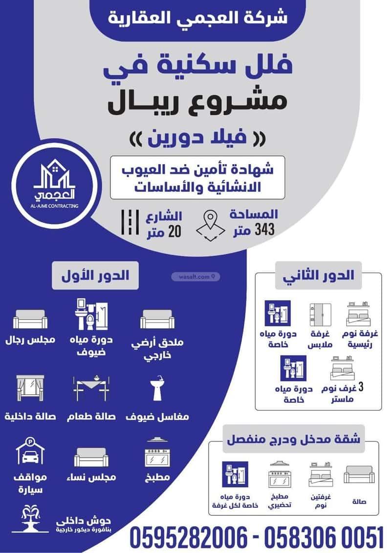 مكونة من: 2 دور و 6 غرف و 4 دورات مياه و 5+ صالات و 3 مجالس و 1 شقة
