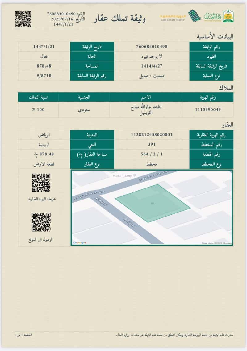 بيت هدد في وقع استرتيجي وحي سكني راقي. قريب من جميع المواقع اللحيوية والاستراتيجيه المراكز التجارية كارفور، العثيم، البريد السعودي، جامع وحديقة الروضة مترو خريص. فرصة لبناء وحدات سكنية استثمارية. تقع على ش ٢٠ شمالي نافذ على الثلاثين و ١٥ غربي. المساحة ٨٧٨م٢. عليها سومة سابقه ٦٥٠٠ للمتر والبيع قريب من سعر السومه اعتذر للوسطاء.