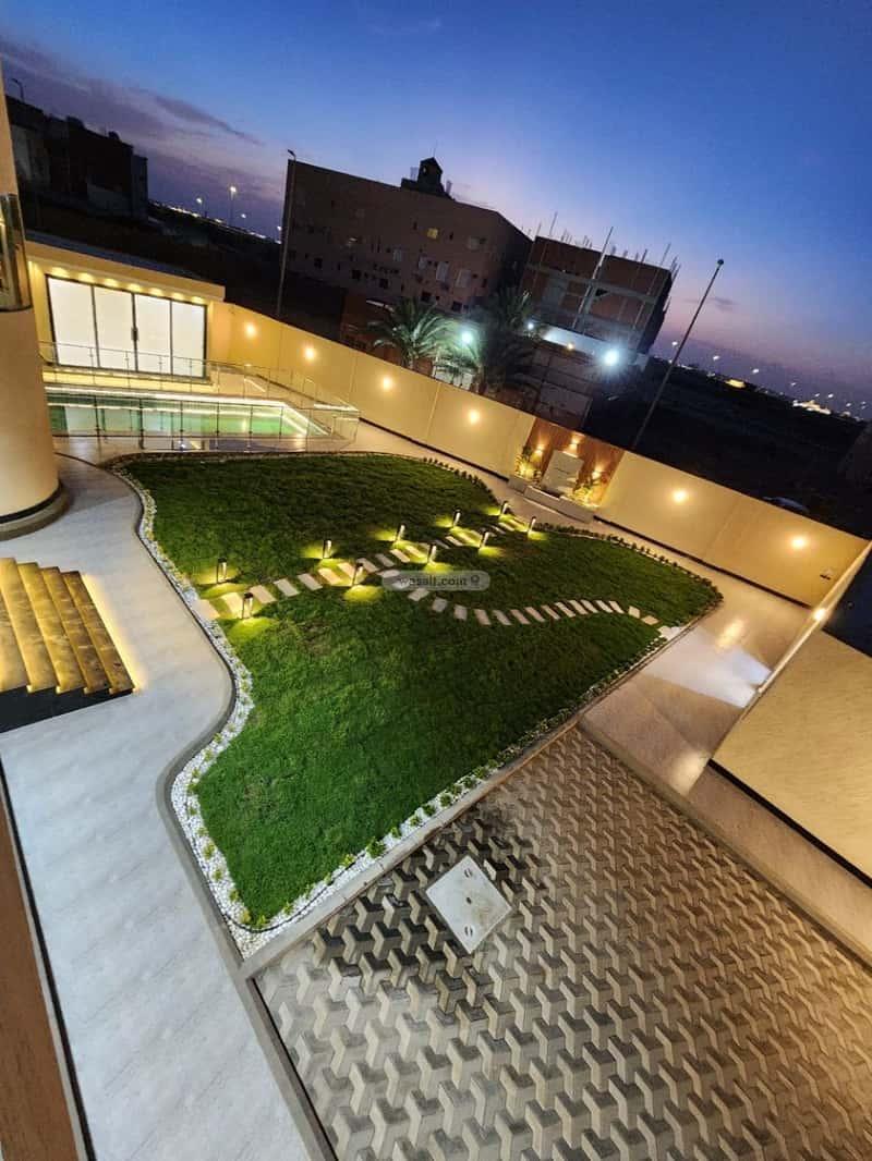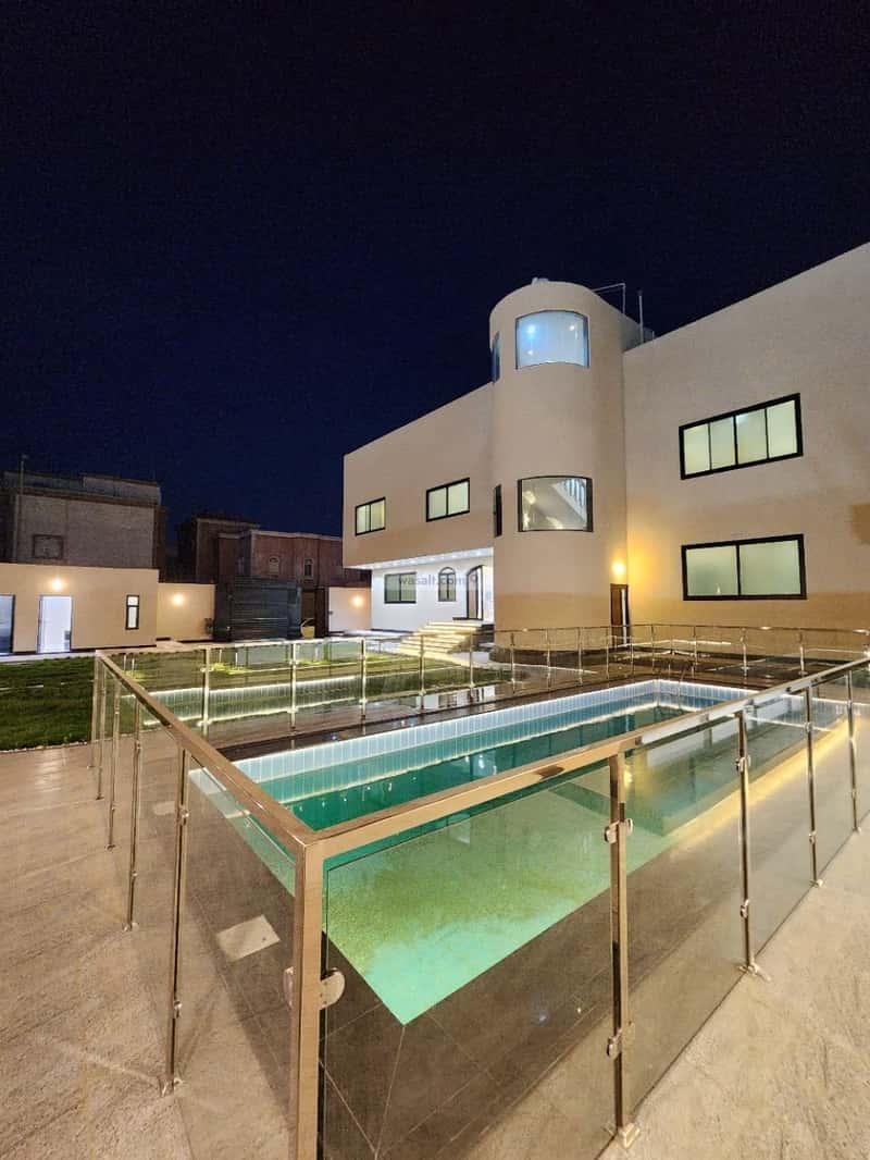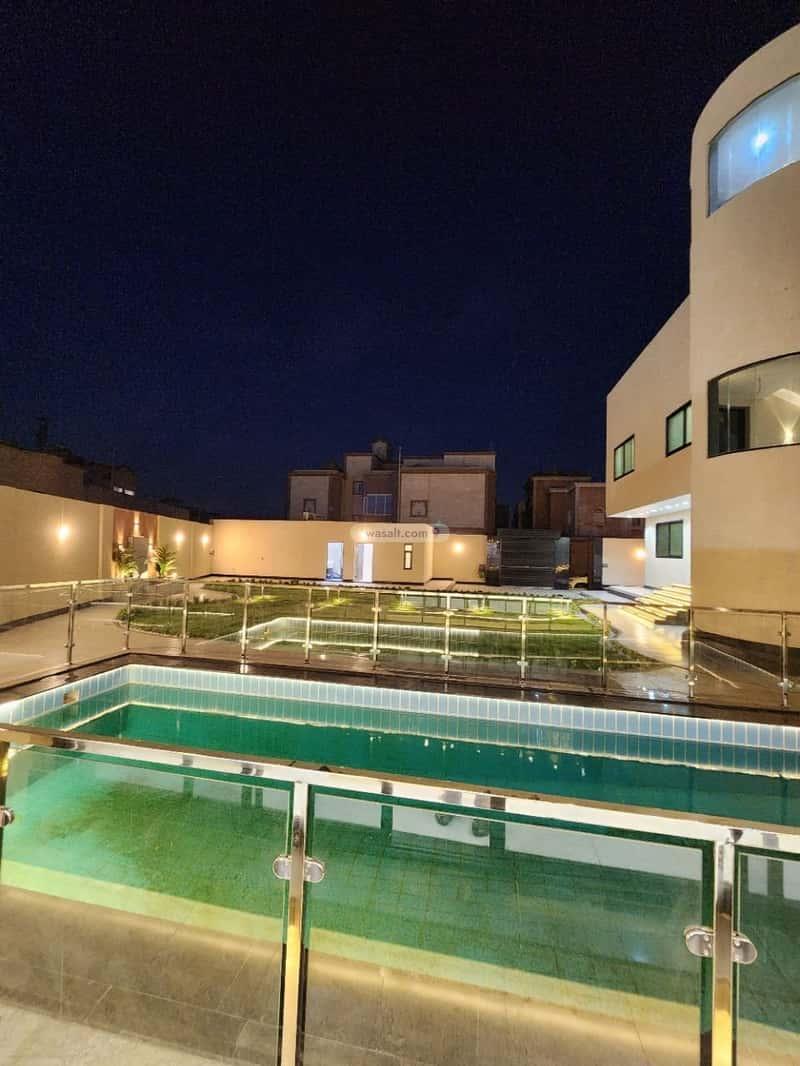 فناء خارجي يشمل التالي: حديقة كبيرة + حديقة مخصصة لألعاب الأطفال + مسبح كبير جداً + شلال روماني + مجلس زجاجي مطل + دورة مياه ومغاسل + مستودع + مواقف داخلية سعة سيارتين + غرفة حارس خارجية تشمل دورة مياه.
